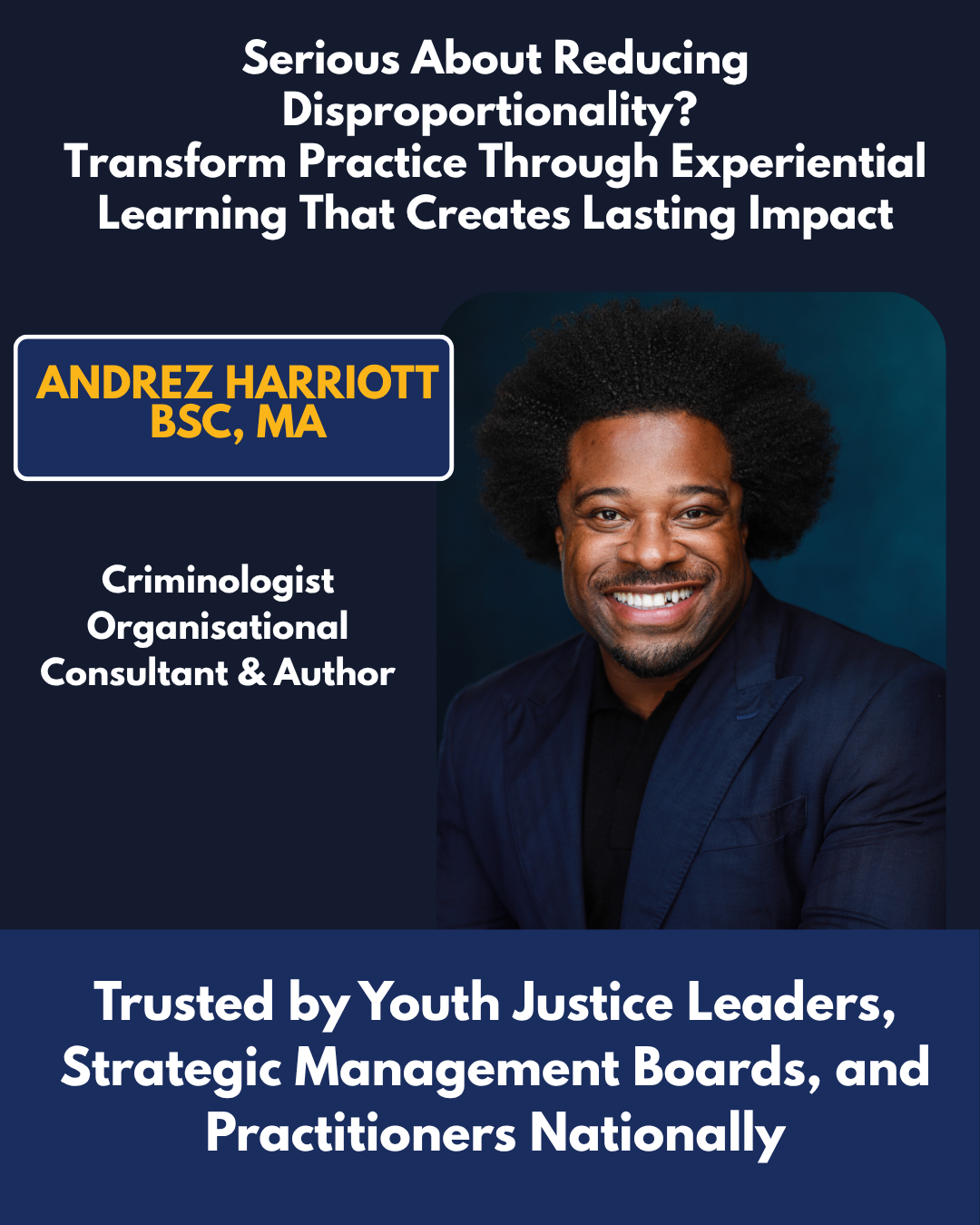 With over 20 years of experience having delivered The Liminality Group's framework for integrated care to over 2500 children and young adults who have been sentenced or remanded for various offences, Andrez Harriott brings a wealth of understanding and knowledge to consultancy, experiential learning, training and keynote speeches.